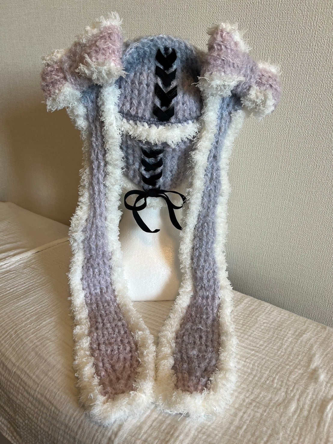 淡いパープル、ブルー、ピンクのグラデーションカラーの帽子に後ろのベルベットの黒リボンがアクセントのかわいすぎるロップイヤー風猫耳ニット帽です。
