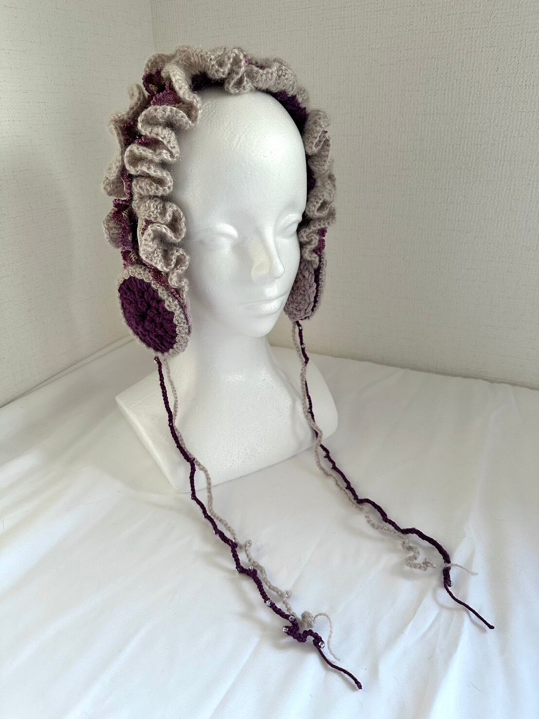 フリルにはレース、紐部分にはビーズがついたビビットカラーのパープルが可愛いイヤーマフ!