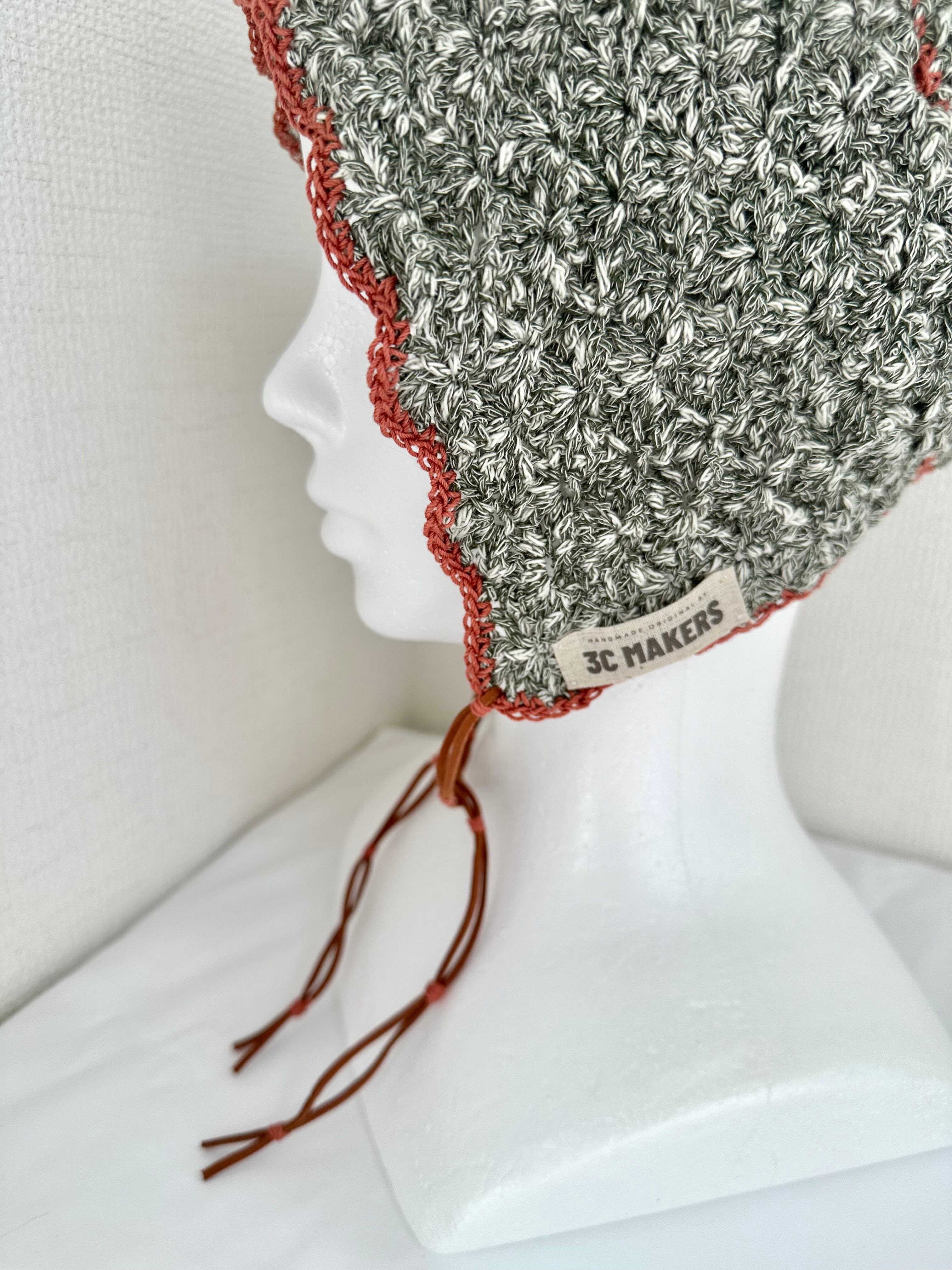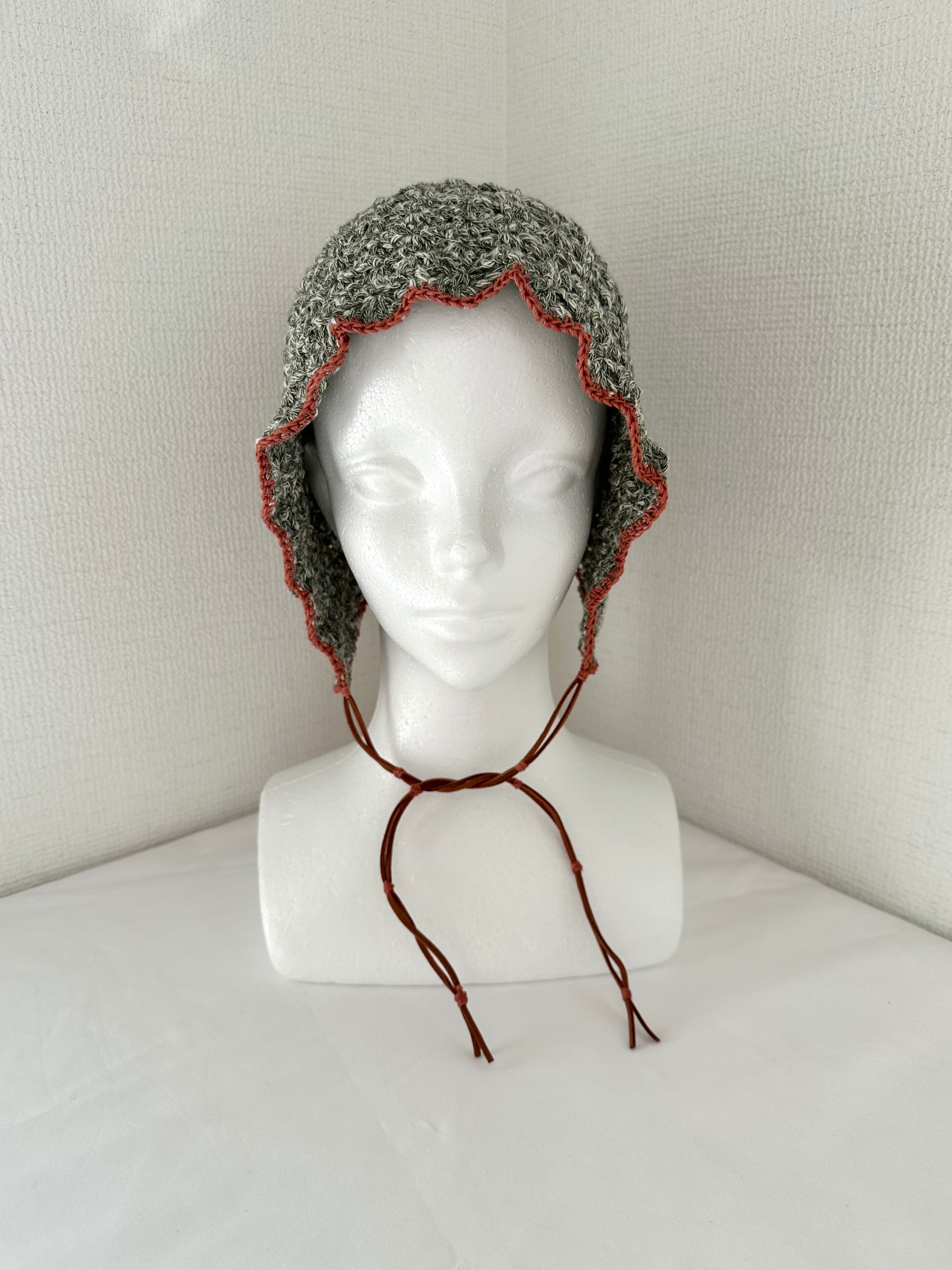差し色のオレンジとスエードの紐がワンポイントの春夏使用ボンネットです